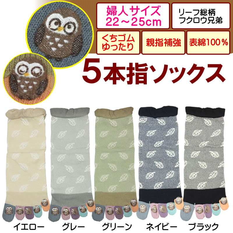 靴下 五本指 婦人≪レディース 5本指 クルー ソックス リーフ総柄フクロウ兄弟 ≫ 梟 ふくろう 鳥 動物 ゆったり 表綿100% 蒸れ防止スポーツ フィットネス ヨガ ジョギング ランニング