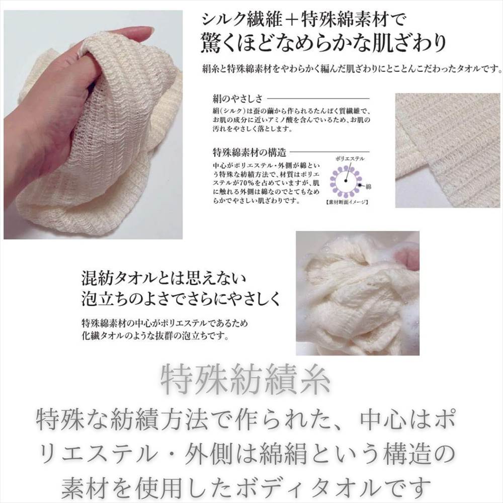 【本体サイズ(mm)】 (約)250×900 【材質】 ポリエステル50%・絹30%・綿20% 【生産国】 日本 【商品説明】 ●適度な肌ざわりですっきりと洗えます。