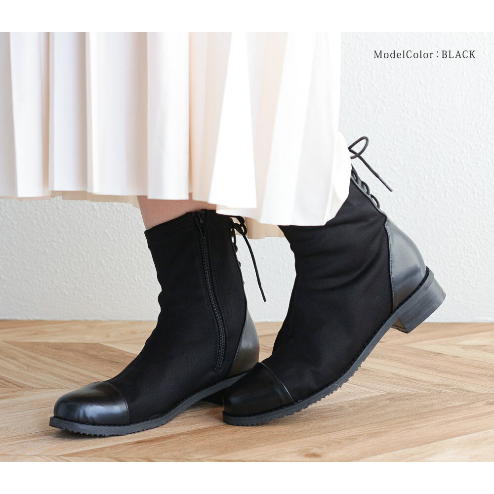 撥水 ストレッチ ショートブーツ ブラック ブラウン レディース ローヒール 歩きやすい ミドル丈 ソックス風 異素材 ドッキング サイドジップショートブーツ 黒 ブラック おしゃれ キレイめ トレンド ぺたんこ 編み上げ 靴 6080 送料無料