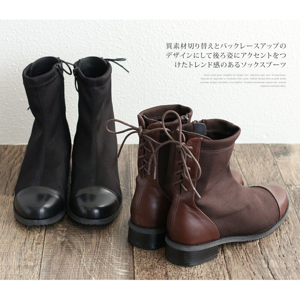 異素材切り替えとバックレースアップのデザインにして後ろ姿にアクセントをつけたトレンド感のあるソックスブーツ ストレッチブーツはアンクルがキュッと細くくびれて、自然と足首が華奢にみえる♪