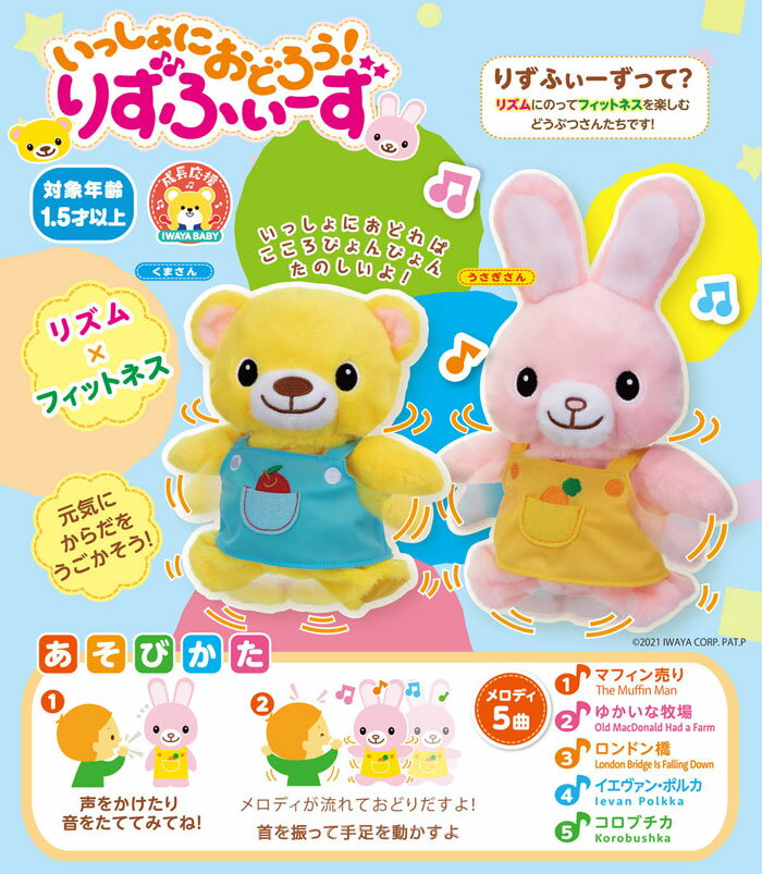本商品は、通常1〜2営業日以内に発送(営業日6時までのご注文分)お支払い方法・送料についていっしょにおどろう!りずふぃーず くまさん 電動ぬいぐるみ 【リズフィーズ クマさん 熊 メロディ リズムダンス 踊る 音楽 鳴る 動く 動物 知育玩具 イワヤ】いっしょにおどろう!りずふぃーず くまさん 電動ぬいぐるみ 【リズフィーズ クマさん 熊 メロディ リズムダンス 踊る 音楽 鳴る 動く 動物 知育玩具 イワヤ】『りずふぃーず』はリズムにのってフィットネスを楽しむどうぶつさんのこと!声をかけたり音をたてるとメロディが流れてどうぶつさんがおどりだすよ!首をふって手足を動かす姿を見ているだけで元気になりそう♪