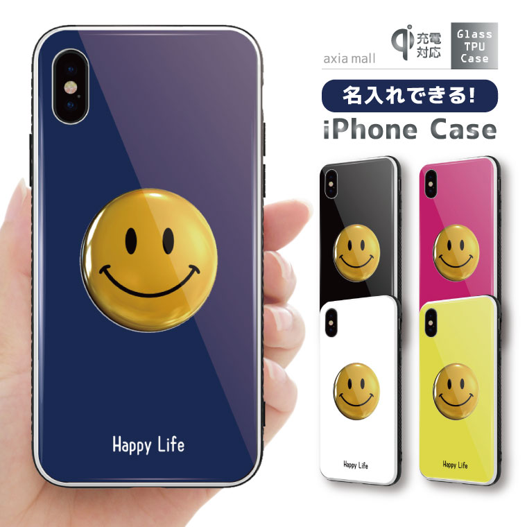 【名入れ できる】ガラスケース iPhone14 Pro Max iPhone13 mini Pro ケース iPhone12 iPhone11 iPhone SE SE2 SE3 ケース スマホケース ガラス 強化ガラス 背面ガラス 耐衝撃 おしゃれ 海外 スマイル ニコちゃん デザイン Smile 文字入れ