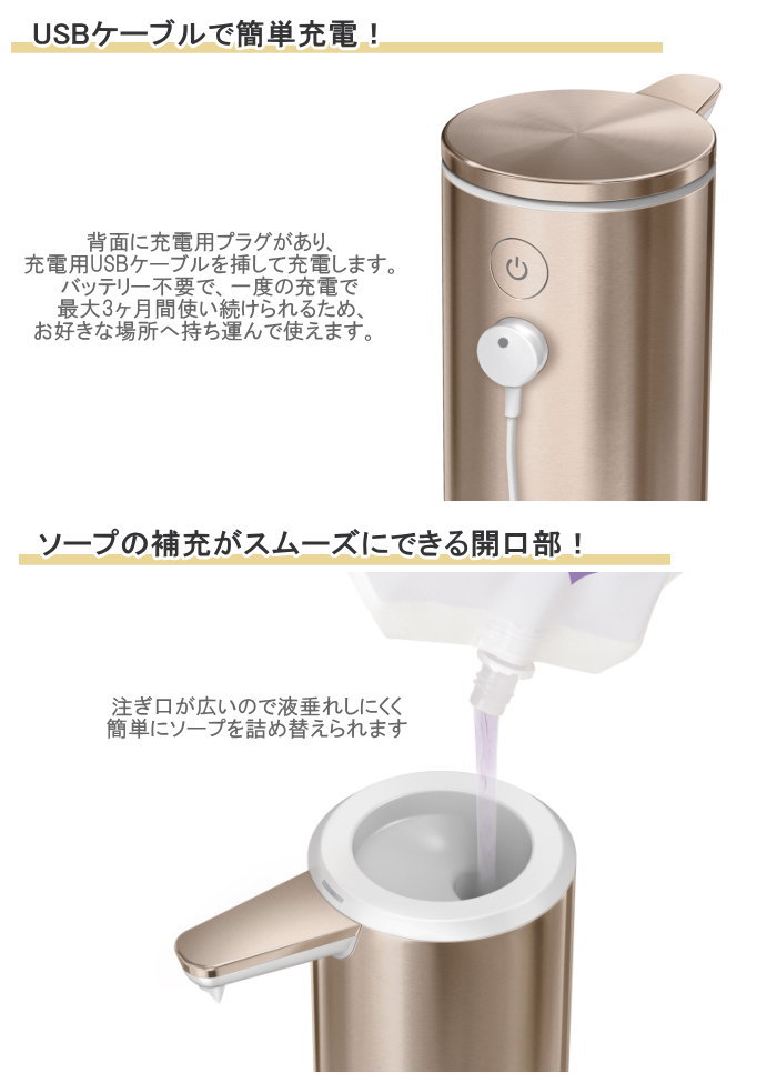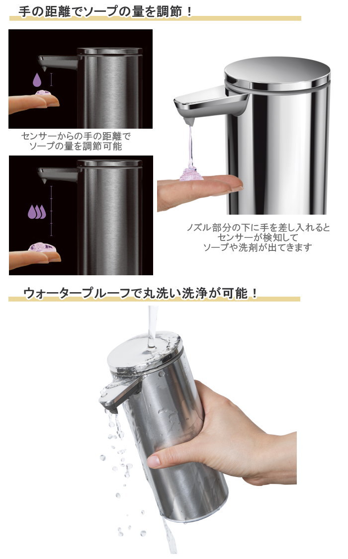 コードレスの充電式 ・Spec 商品名 simplehuman センサーポンプディスペンサー266ml 素材 本体:ステンレススチール・ABS樹脂/SAN樹脂 パッキン:シリコーン サイズ w約7cm×d約11.2×h約17.2cm 容量:266ml 重さ:約380g 備考 電源:内臓リチウムイオン電池 付属品:充電用USBケーブル 推奨洗剤 液体(スクラブ剤を含まないソープ) ●ハンドソープ ミューズ/キレイキレイ/naive/メディッシュ/ハンドソープ(資生堂) ●台所用洗剤 ファミリーフレッシュ/泡のチカラ/Magica除菌+/クリスタ/JOY W除菌/ヤシノミ洗剤 ( 2017年9月調べ 上記洗剤は動作上、問題がない事を確認しております)