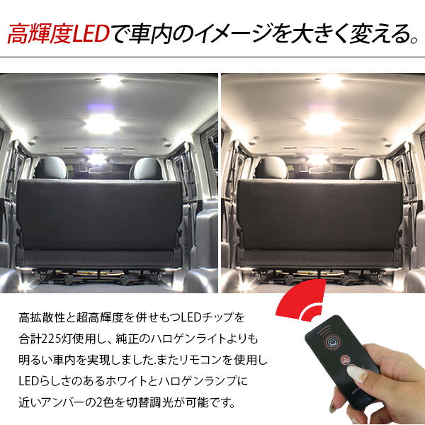 ハイエース200系 4型/5型/7型カラーチェンジ LEDルームランプ8点セット 商品説明 【適合車種】200系ハイエース/レジアスエース(KDH200/TRH200系) 標準/ワイドボディ 4型/5型/7型(H25.12〜) スーパーGL専用 【商品説明】 ・ハイエース200系 ホワイト⇔暖色の2色切り替え可能なLEDルームランプ。
