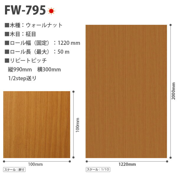 メーカー希望小売価格はメーカーカタログに基づいて掲載しています ■商品詳細 メーカー/カタログ スリーエムジャパン(旧:住友スリーエム) / DI-NOC Film 品番 FW795 商品詳細 ■木種:ウォールナット ■木目:柾目 ■リピートピッチ:縦990mm / 横300mm 1/2step送り ■ロール幅(固定):1220mm / ロール長(最大):50m 特長 3M(スリーエムジャパン)ダイノックフィルムは粘着剤付き化粧塩ビフィルムです。
