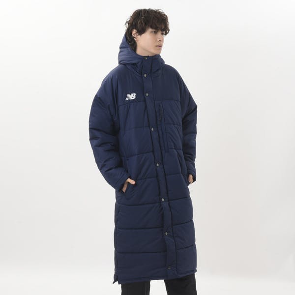 メンズ・ユニセックスサッカー/ラバー胸のワンポイントNBロゴと後裾のリニアロゴでアレンジしたベーシックな中綿ロングコート。
